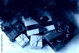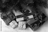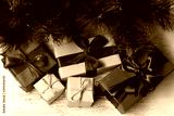 Gift boxes on a wooden light background near fir branches. Christmas composition