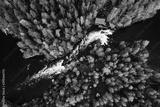 Aerial view of fast river flow through the rocks and colorful forest. Autumn in Finland