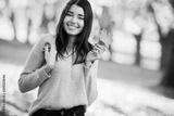Beautiful woman posing for the camera with autumn leaf. Happy Autumn.