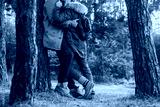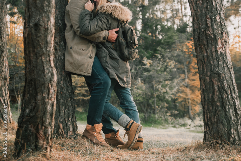 Hiking couple with backpack walking in the forest and exploring outdoors. Freedom and active travel concept.