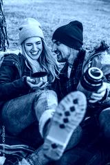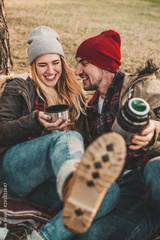 Travel couple camping with thermos having fun in the forest. Concept of trekking, adventure and seasonal vacation.