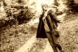 Hiking and travel along in the forest. Concept of trekking, adventure and seasonal vacation. Young woman walking in woods.