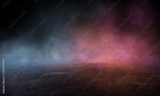 Wet asphalt, reflection of neon lights, a searchlight, smoke. Abstract light in a dark empty street with smoke, smog. Dark background scene of empty street, night view, night city.