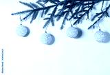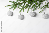 Christmas border of natural spruce branches, white with silver ornament balls on a white background. Flat lay, top view, copy space. Christmas background