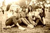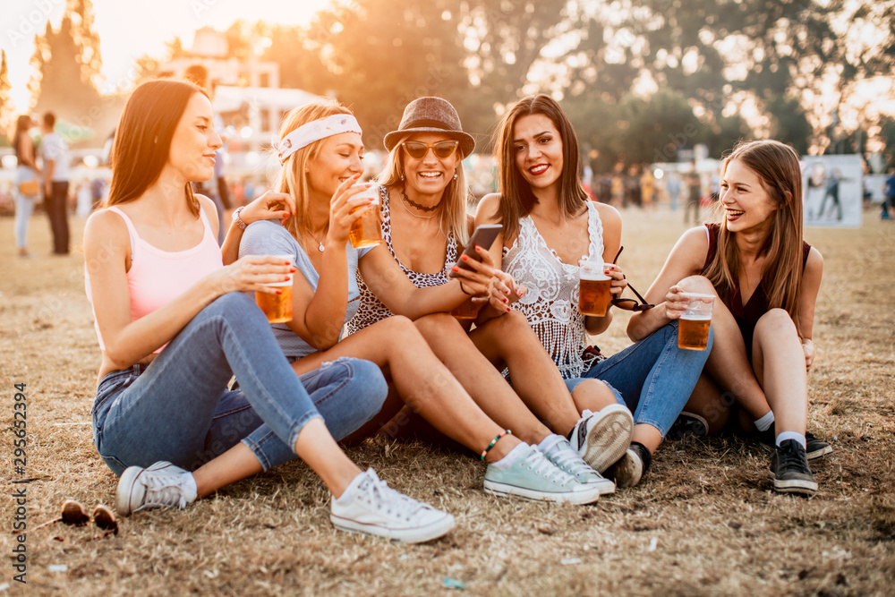 Friends drinking beer and using mobile phones at music festival
