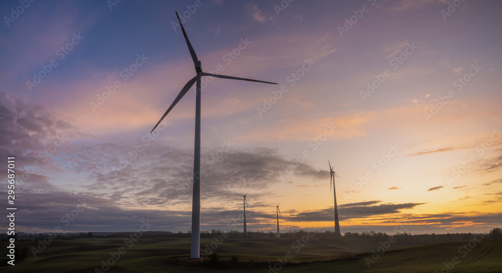 windmills on a field in Germany during a beautiful multicolored sunrise