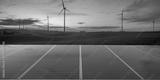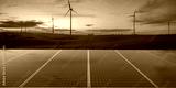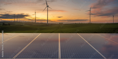 clean energy concept, photovoltaic panels and wind turbines in the light of the rising sun