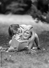 Mother and son playing fools while reading on a rug amidst a summer park lawn