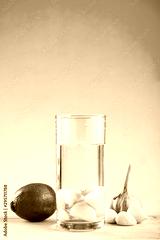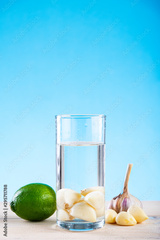 Head of garlic in a glass of water on a blue background with a slice of lemon, garlic water, lemon water, disease prevention