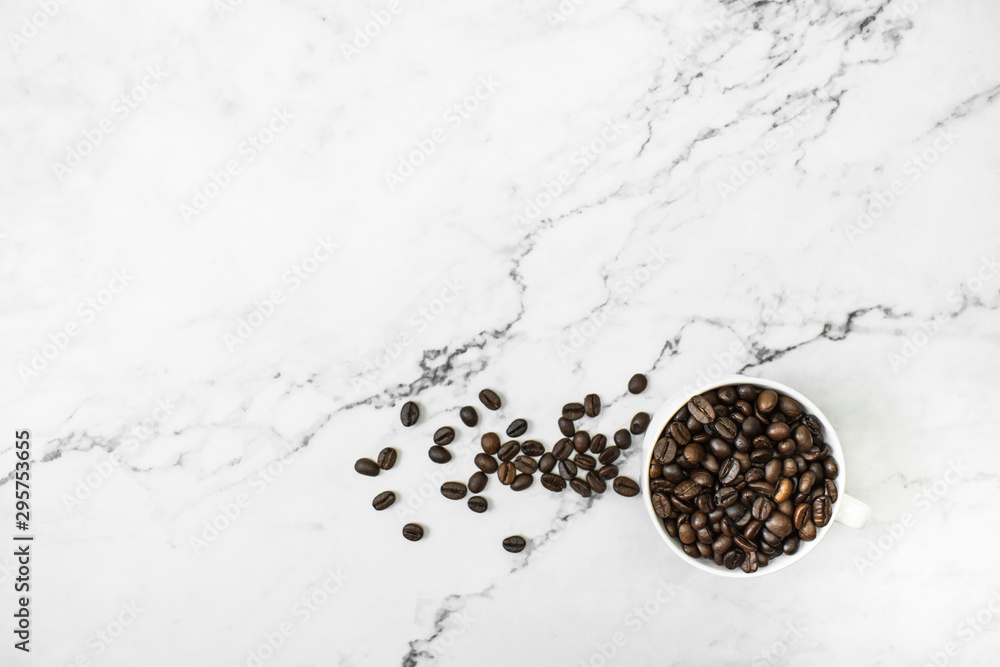 Brown coffee beans with coffee on a marble background with copy space on top of the image.