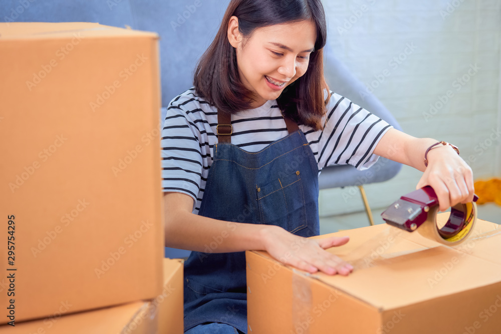 Startup small business concept, young Asian woman owner working and packing on the box to customer at the sofa in home office, seller prepares the delivery.