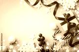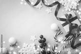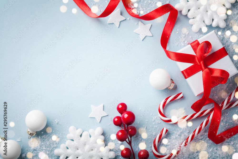 Christmas blue background. Gift or present box and holiday decoration top view. Happy New Year greeting card.