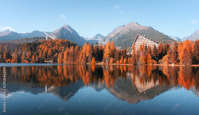 Panorama of mountain lake Strbske pleso (Strbske lake) in autumn time. High Tatras national park, Slovakia. Landscape photography
