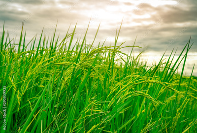 Green rice paddy field. Rice plantation. Organic jasmine rice farm in asia. Rice growing agriculture. Beautiful nature of farmland. Asian food. Paddy field wait for harvest. Plant cultivativation.