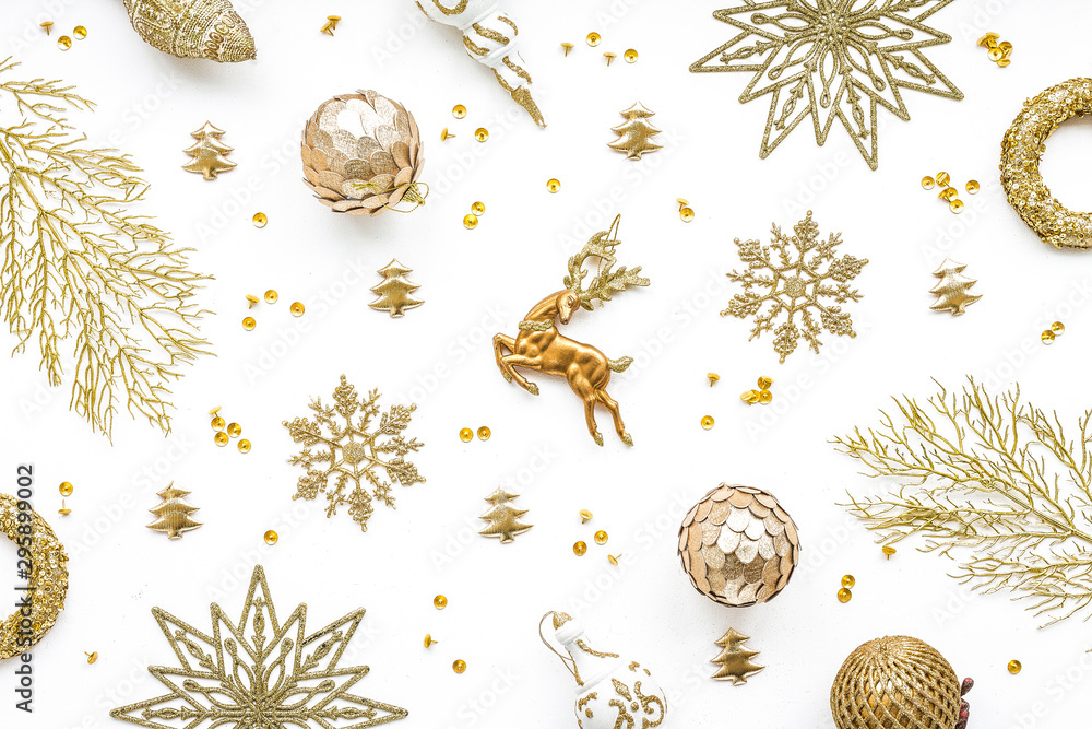 Gold christmas decoration on white background, flat lay, top view