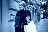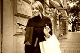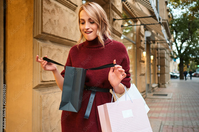 Attractice casual blond girl excitedly looking in shopping bag on street