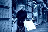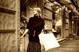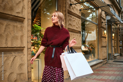 Beautiful stylish blond girl in knitted sweater with shopping bags dreamily walking through street