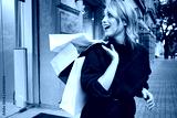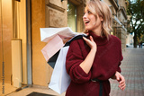 Attractive casual blond girl in knitted sweater with shopping bags on shoulder happily looking away on street