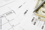IRS Form 1095-A 1095-B and 1095-C blank lies on empty calendar page with pen and dollar bills