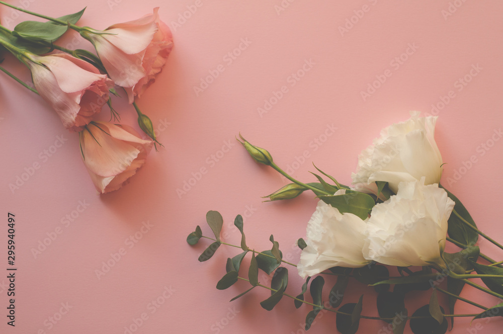 Beautiful pink eustoma flower (lisianthus) in full bloom with green leaves. Вouquet on pink background.
