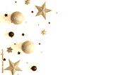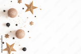 Christmas composition. Golden and black decorations on white background. Christmas, winter, new year concept. Flat lay, top view, copy space