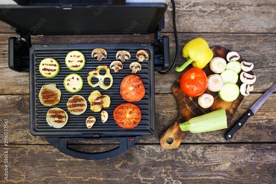 Grilled sausage and vegetables on the electric grill. Top view. Flat lay.