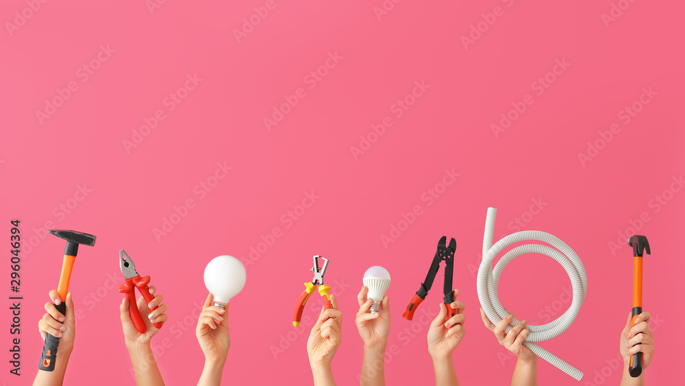 Female hands with electrician's tools on color background