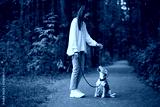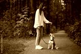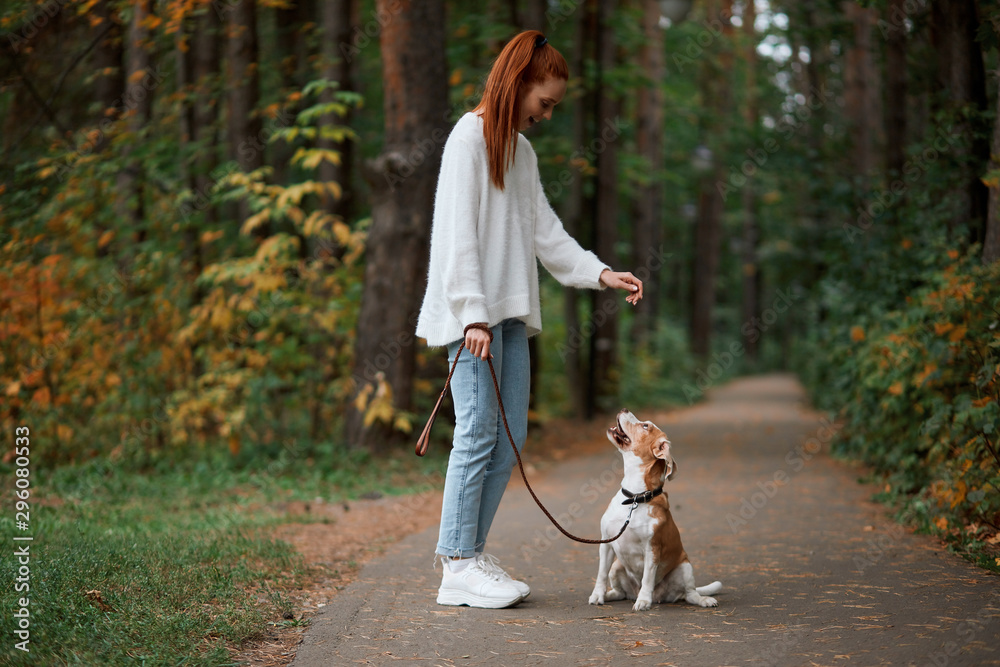 young ginger woman taming her pet perform some commands. full length side view photo.
