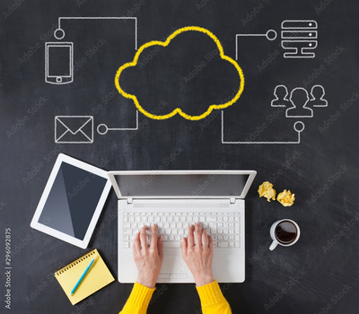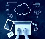 Directly above of a business woman's hand using laptop
