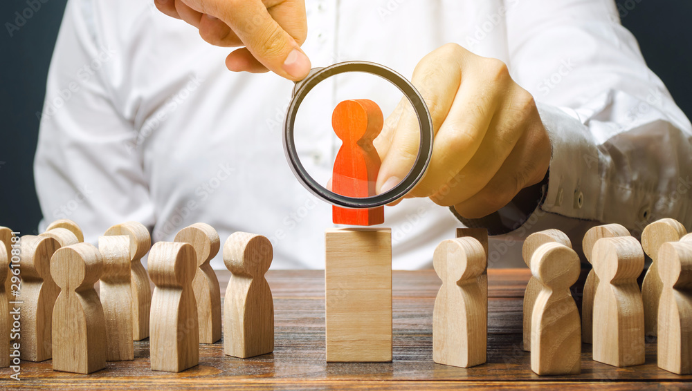 Team leadership concept and choosing a new leader. Choice of person. Hiring and recruiting. Human resource management. Talented worker. Wooden figures of people. Selective focus