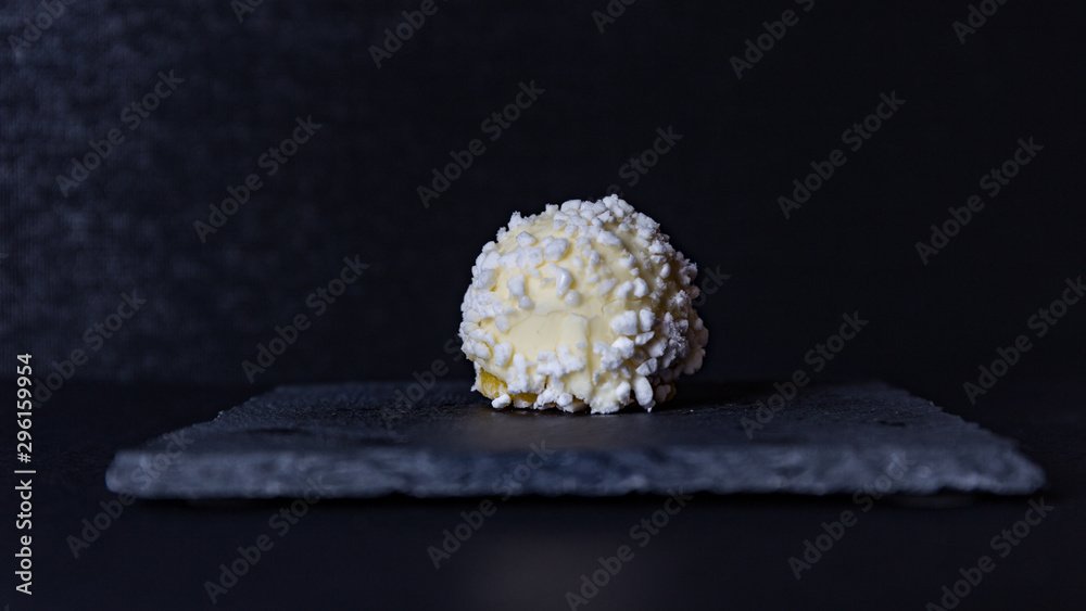 white truffle-shaped chocolate dessert on a black background