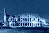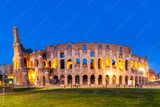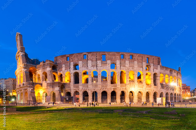 The Colosseum in Rome, Italy at sunset twilight. Blue hour photo in the evening. The world famous colosseum landmark in Rome.