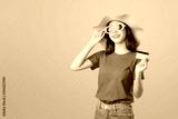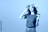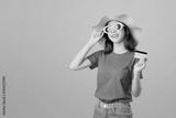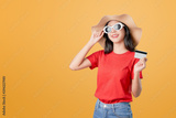 Beautiful Asian woman good skin, wearing sunglasses posing holding credit card payment on orange background.
