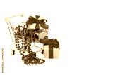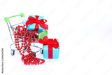 Christmas holiday composition. Cart with gifts. Christmas shopping. With space for your text. Gifts in blue packaging with a red bow on a white background.