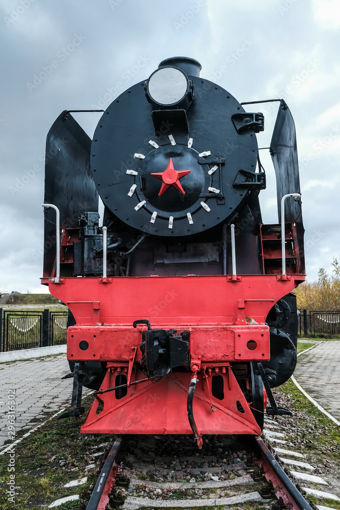 Old Russian locomotive. Steam locomotive with red wheels. Retro locomotive on rails. Black locomotive with red star.