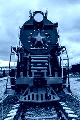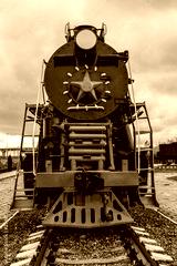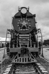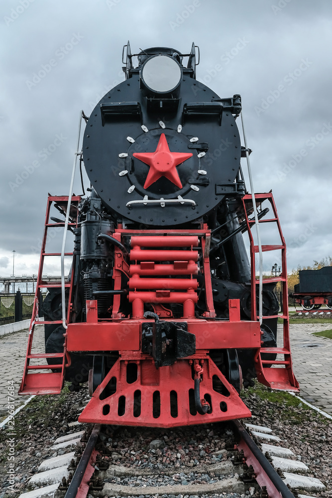 Old Russian locomotive. Steam locomotive with red wheels. Retro locomotive on rails. Black locomotive with red star.