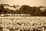 Train headed for Florence, passes by a beautiful sunflower field in Tuscany, Italy