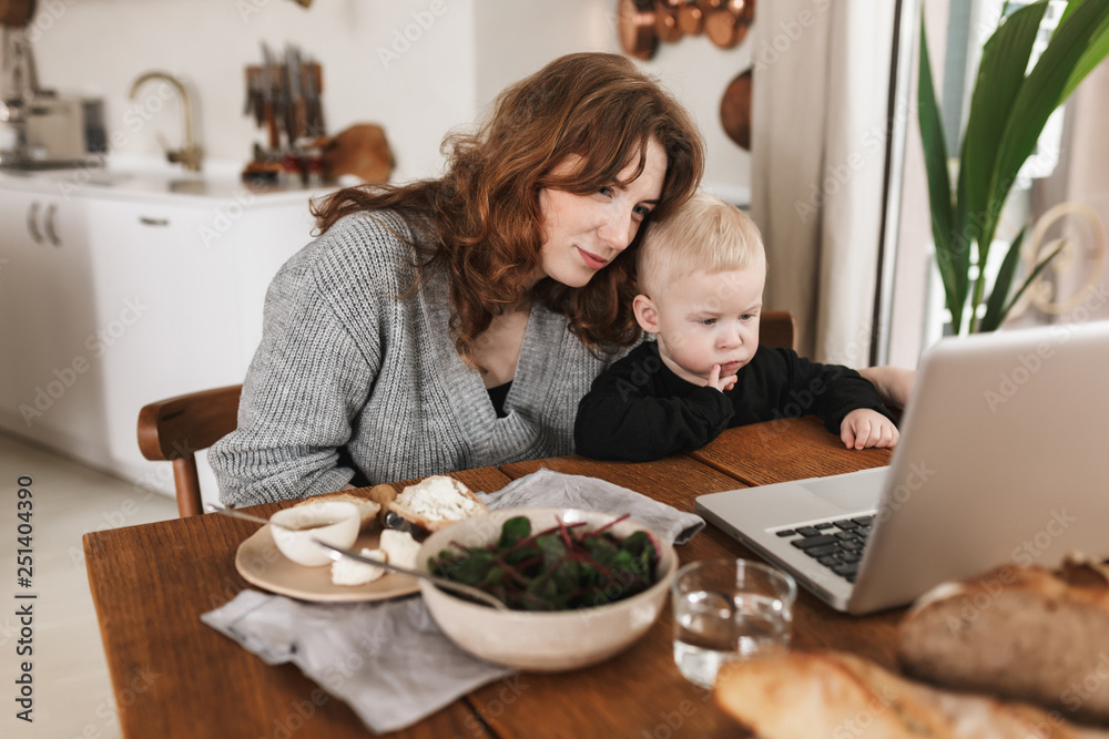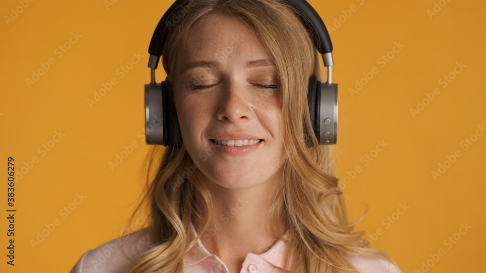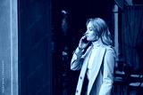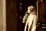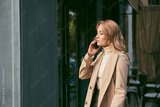 Side view of attractive blond girl in stylish trench coat thoughtfully talking on cellphone outdoor