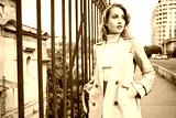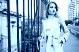 Attractive casual blond girl in stylish trench coat confidently looking away on bridge