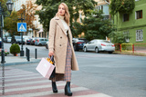 Attractive casual blond girl in stylish trench coat with shopping bags thoughtfully walking on pedestrian crossing