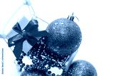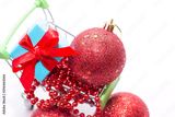 Christmas holiday composition. Gifts in blue packaging with a red bow in a grocery cart. Cart with Christmas baubles on a white background.