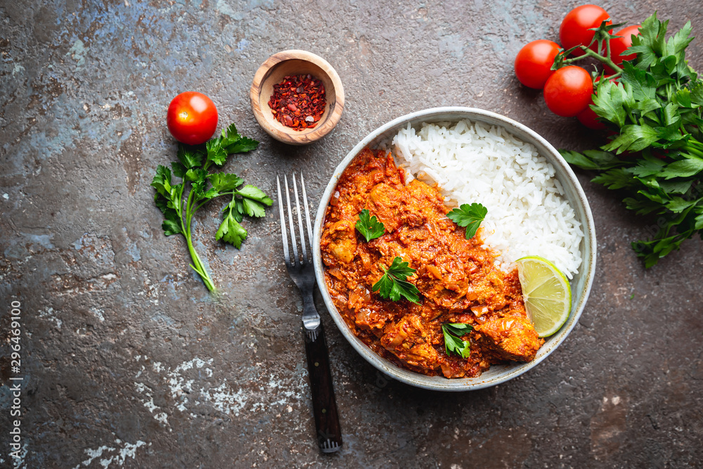 Chicken meat with tikka masala sauce, spicy curry food in a bowl with rice and seasonings, top view