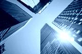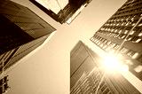 Looking up at New York skyscrapers against the sun with lens flare, color toned picture, USA.