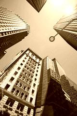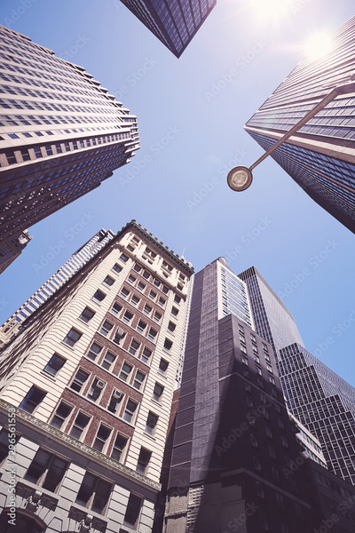 Looking up at New York skyscrapers against the sun with lens flare, color toned picture, USA.