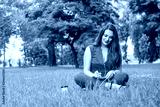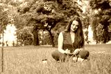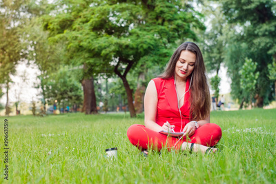 Portrait of young smiling business woman in red suit in earphones, doing online learning cources and writing in notebook while sitting on the green grass lawn in park. Self-development. Copy space.