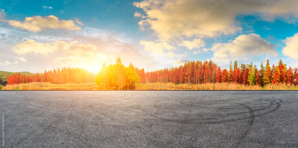 Empty race track ground and beautiful colorful forest landscape in autumn