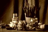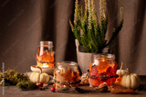 Autumn lantern jars decorated with colorful leaves and heather wreath