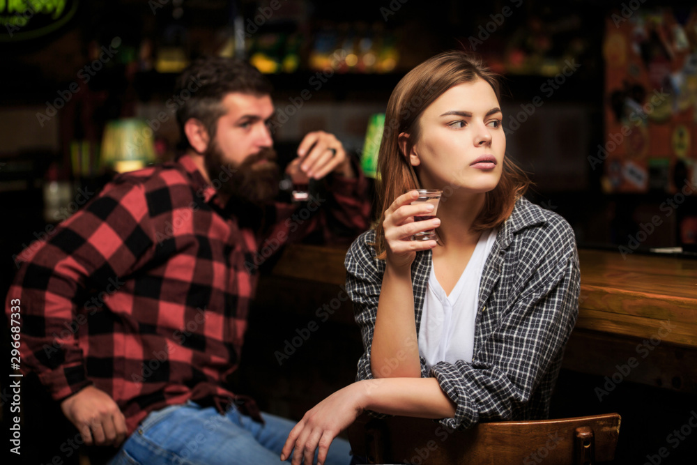 Female male alcoholism. Woman and man alcoholism. Woman alcoholic beverage in bar. Young woman has problems with alcohol. Alcoholism, alcohol addiction, male alcoholic. Young man drinking alcoho