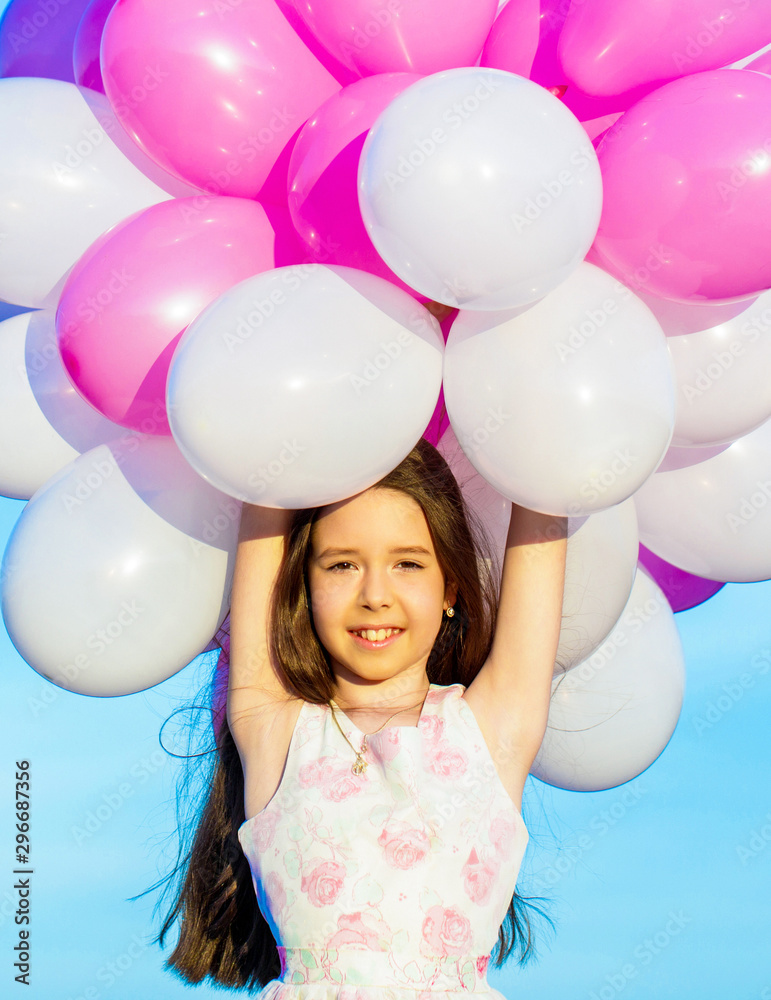 Summer holidays, celebration, children happy little girl with colorful balloons. Portrait of a happy teenager or preteen. Childs birthday party, celebrate, holiday. Little girl with balloons