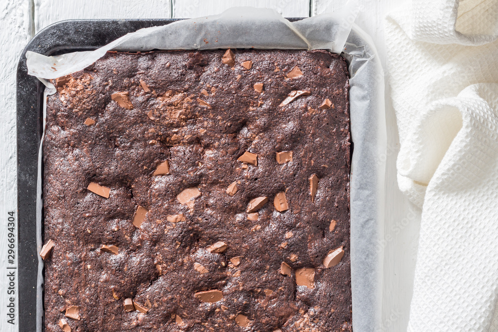 Chocolate brownie cake baked in baking tray just out of oven - with white dish towel
